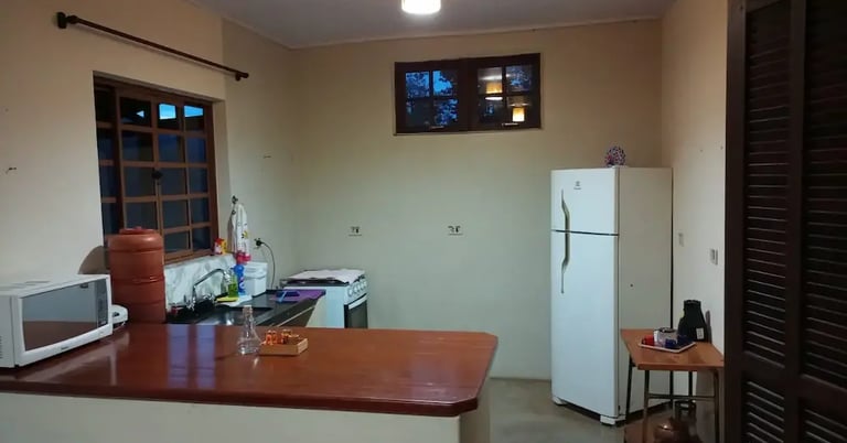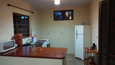 Cozinha completa com todos os utensílios, micro-ondas, geladeira e fogão. Ideal para preparar um café da manhã calmo ou um jantar especial na varanda.